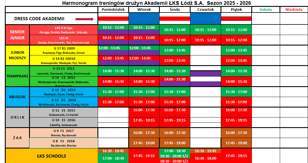 Staż w Akademii rozpoczynał się dotąd w poniedziałek o godz. 9,30, a kończył w piątek wieczorem lub w sobotę – obserwacją meczu i analizą gry wybranej drużyny ŁKS Łódź. Staż realizowany jest zgodnie z planem treningowym Akademii i obejmuje udział w zajęciach treningowych WSZYSTKICH drużyn w Akademii. Nie realizujemy stażu tylko przy wybranej drużynie np. ŁKS II Łódź. W trakcie stażu przewidujemy spotkania z: