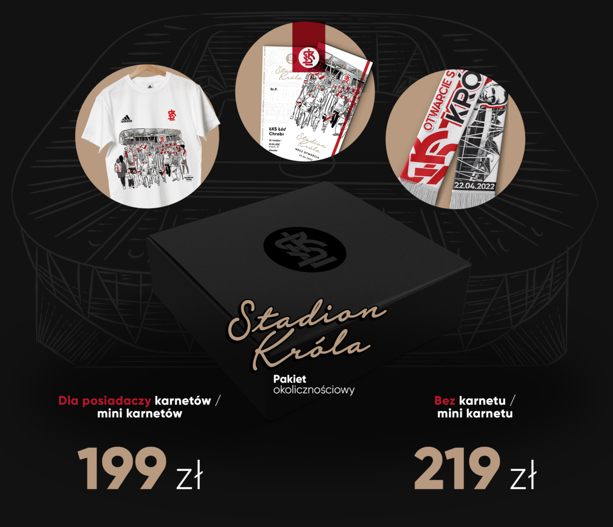 W okolicznościowym pakiecie dla kibiców znajdziecie wydane z okazji otwarcia stadionu Króla i wykonane z doskonałych materiałów – specjalną koszulkę, szalik, pamiątkowy bilet oraz dedykowany list od klubu z podziękowaniem za zakup, a wszystko to w eleganckim pudełku. Ta wyjątkowa pamiątka trafi do sprzedaży już we wtorek 19 kwietnia od godz. 15 i znajdziecie ją w kasach os strony al. Unii.