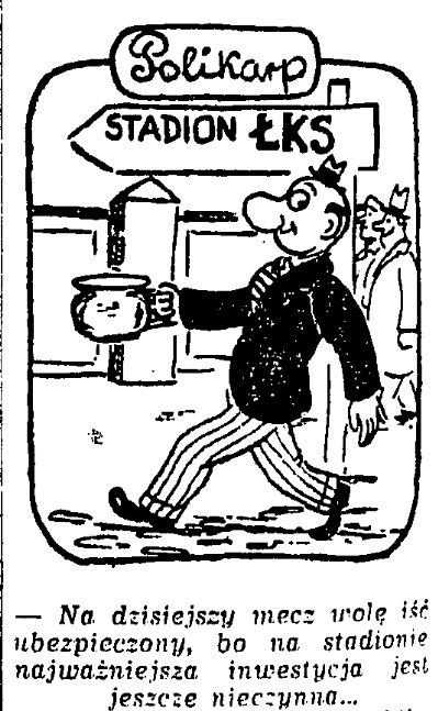 Trop wiodący na al. Unii 2 na łamach popularnego komiksu pojawił się zresztą znacznie wcześniej, bo prawdopodobnie już w latach 50. Tym razem na obrazku widzimy poczciwego Polikarpa, który podąża w kierunku stadionu ŁKS z pojemnikiem w dłoni. Dlaczego? Ano prawdopodobnie dlatego, że w tym akurat czasie na obiekcie brakowało toalet, co zmuszało sympatyków futbolu do częstych wycieczek pod drzewko.