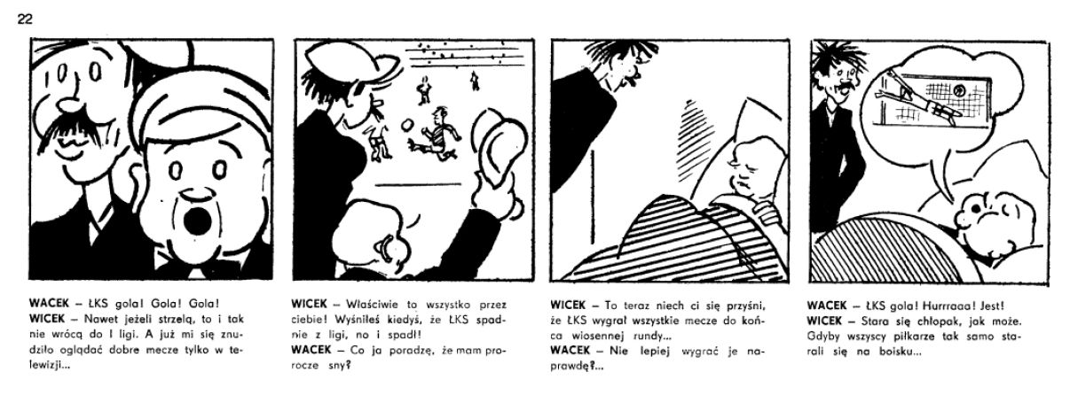 W tej historyjce widzimy, jak sympatyczny grubasek (Wacek) głośno dopinguje piłkarzy, a jego przyjaciel sprowadza go na ziemię, pomstując przy tej okazji na drugoligową zsyłkę ulubionej drużyny. Na końcu wypomina kompanowi, że to przecież Wackowi przyśnił się spadek ŁKS-u z piłkarskiej elity, więc przywołany do tablicy kumpel nie ma wyjścia – wskakuje do łóżka i „chcąc” odczynić zły urok śni o awansie ełkaesiaków do pierwszej ligi.